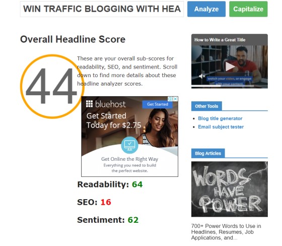 . This tool differentiates itself from the others by using a specific SEO score. The other scores are readability and sentiment. The SEO game is all about getting the search engine to rank your blog highest, and therefore getting a good SEO score could help. A few simple tweaks to my title made the score much better – 73, with SEO skyrocketing to 59, but on top of that the other segments went up too! Oddly enough, their own headline scored poorly using their tool!- The tool will check for filler words which do not add value to your headline.