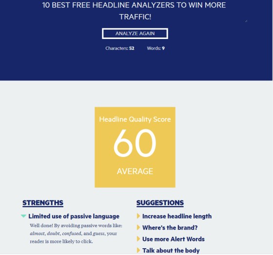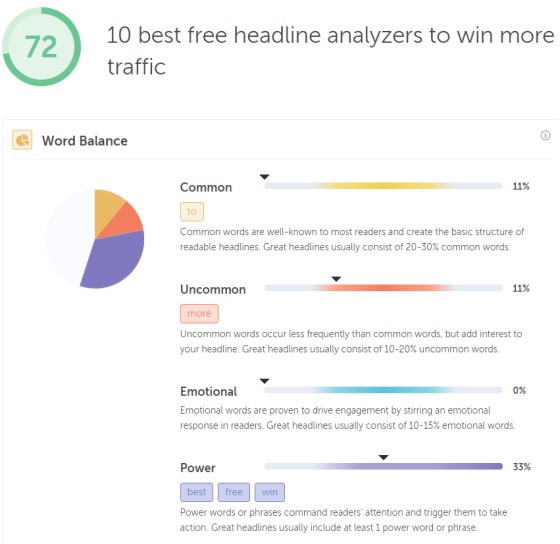 - The tool also gives you a quick breakdown of what works in your title and suggestions on how to improve the strength of the headline, with relevant websites to highlight the point.