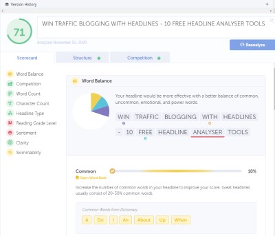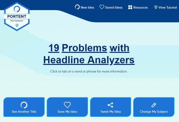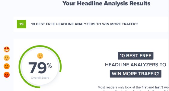– this is a great tool for refining your title until it is perfect. The tool will provide a score across several categories, along with recommendations on how to improve the headline. Implement the suggestions and feed the result back into the tool…- Uses several categories to evaluate the headline.