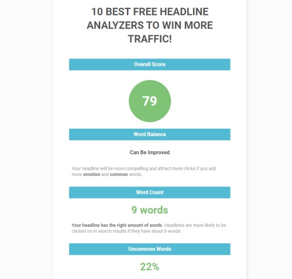 . This tool is possibly the most comprehensive, breaking down your headline into no less than 9 separate categories with easy to understand visuals, allowing you to quickly assess where you might improve your score. The tool has a Chrome Extension, which allows you to easily figure out why the title of any page works.- Similar to OptinMonster, the platform does spread the score across 9 different categories, making it easier to see where to improve the score.