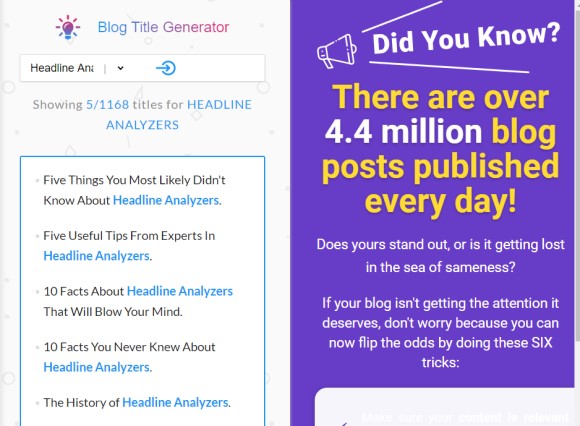 . This is the 2nd non-conformist tool. Just like Blog about Impact, this tool gives you potentially eye catching titles to start with, though they do seem much more “clickbait-like”. The first response involved Spock! Definitely THE right tool for a quirky headline approach!- Dozens of headlines generated at once.